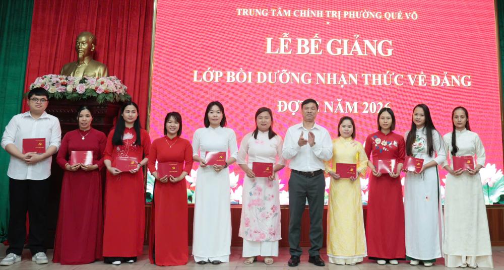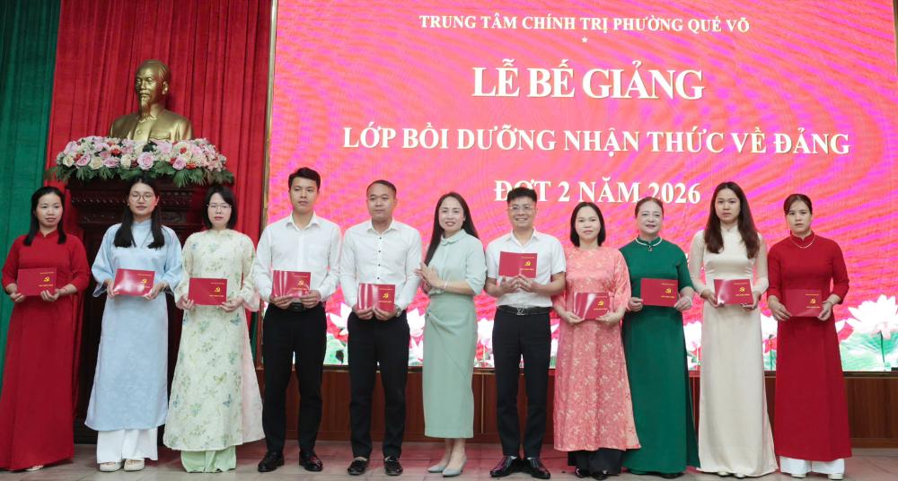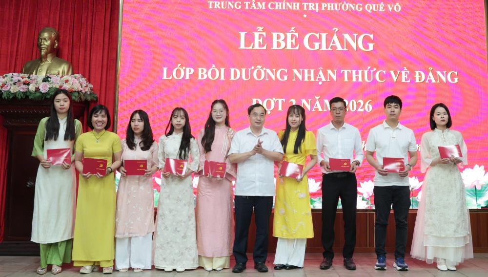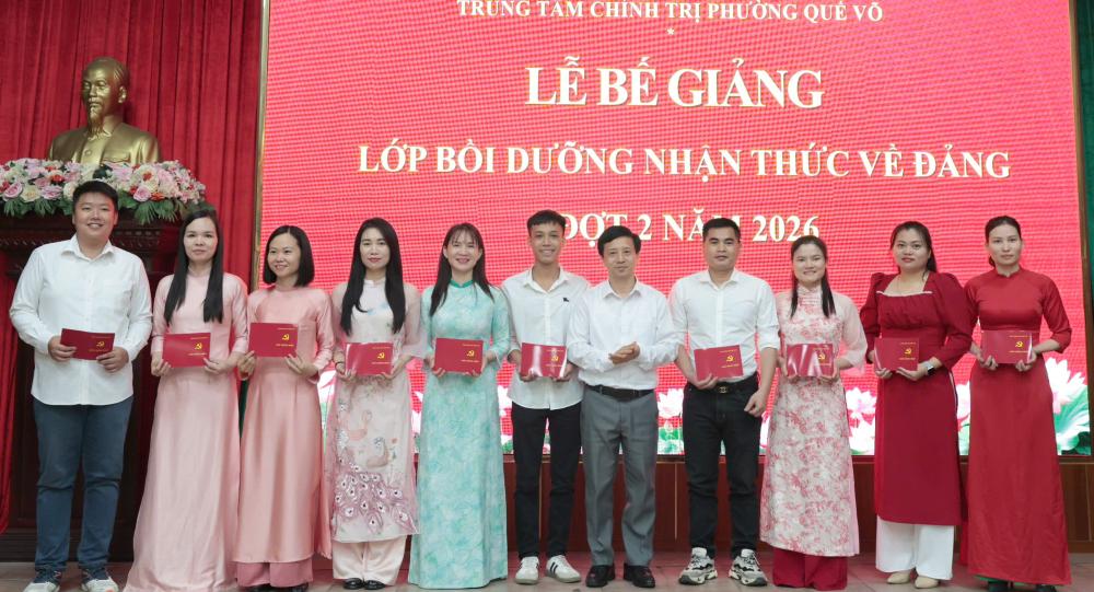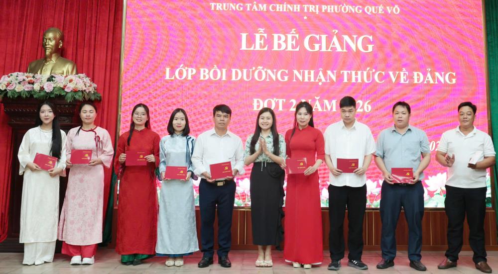 Ngày 6/4, Trung tâm Chính trị phường Quế Võ tổ chức bế giảng lớp nhận thức về Đảng đợt 2/2026 cho 89 quần chúng ưu tú đến từ các Đảng bộ xã, phường trong khu vực Quế Võ.